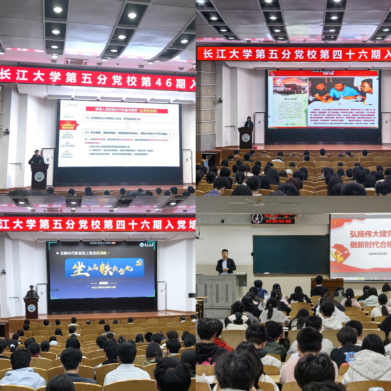 培训期间,分党校精心安排四次专题集中授课,内容系统全面、层层递进。4月7日晚,电信学院党建秘书李蒙以《规范党员发展程序 提升党员队伍质量》为题,系统讲解党员发展全流程,强调严把入口关、规范关键环节,助力学员明晰入党标准、端正入党动机。4月14日晚,电信学院党委副书记张晨露带来《坚定共产党人理想信念,在新征程上续写中国奇迹新篇章》专题辅导,立足新时代使命任务,引导学员筑牢信仰之基、补足精神之钙。4月15日晚,学校机关党委廖鹏程老师围绕《在新时代新征程上推进祖国统一》深入解读,厚植学员家国情怀与使命担当。4月20日晚,化工学院党委副书记杨会军以《弘扬伟大建党精神 做新时代合格党员》为题授课,激励学员传承红色基因,以实际行动践行党员标准。
