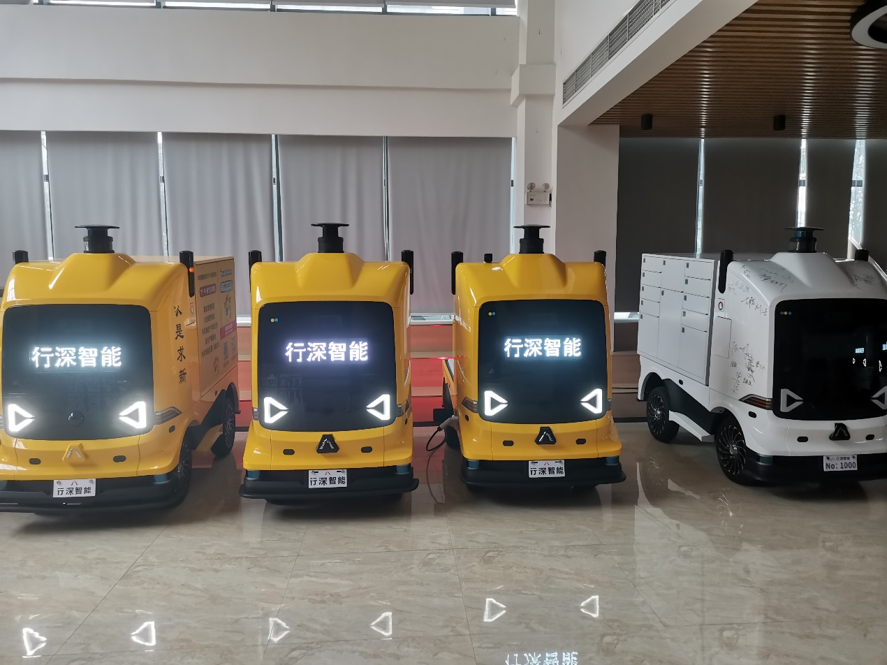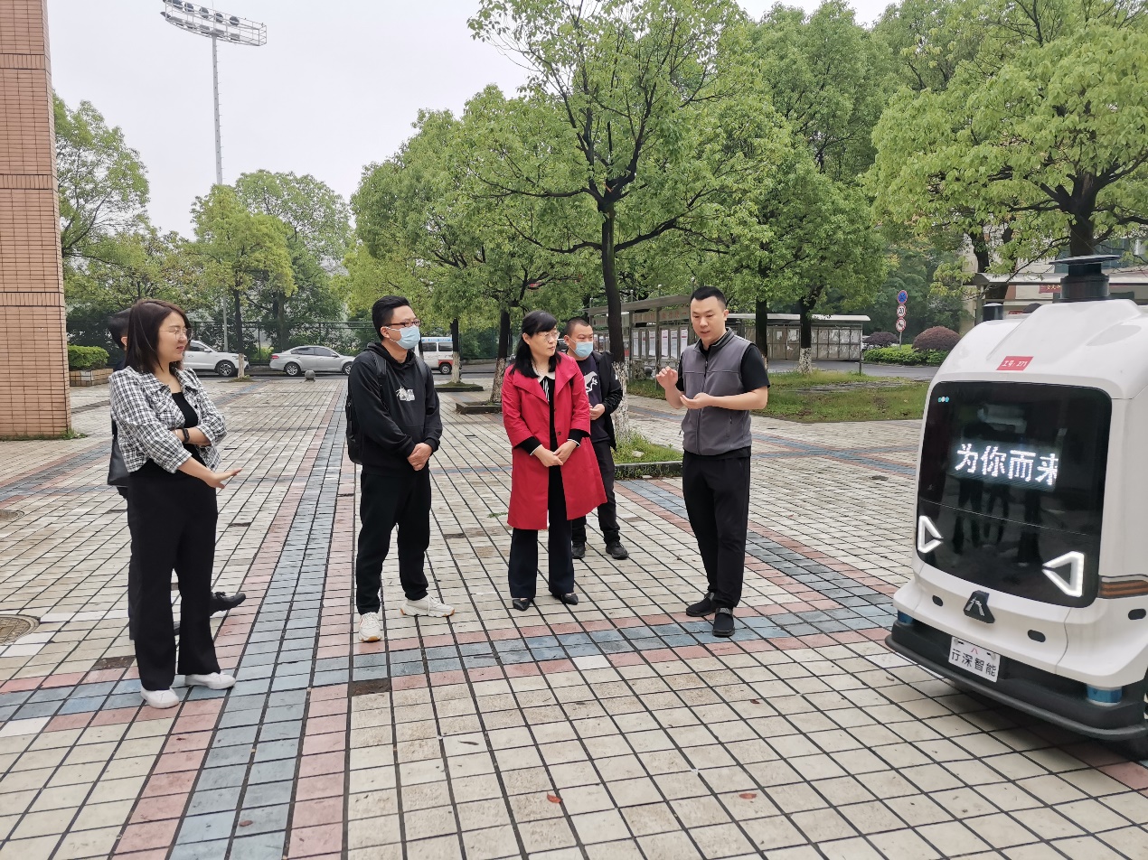随后,双方在湖南城市学院现场参观了行深智能智慧校园应用经典案例之一——无人驾驶小车。目前行深智能无人配送车已经进入全国四十多所高校提供无人配送服务,包括快递无人配送、零售商品无人配送,学生只需手机下单即可预约取件,大大缓解了学生排长队集中取快递现象。此外还有无人驾驶校园防疫消杀车,旨在助力打造安全、有序的智慧校园。