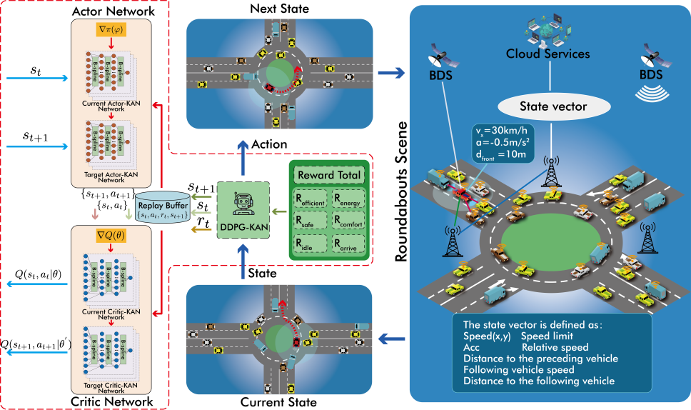 近日,电子信息与电气工程学院数智融合理论及应用研究团队在智能网联汽车生态驾驶优化领域取得重要进展,相关研究成果在国际物联网领域顶级期刊《IEEE Internet of Things Journal》(IEEE IoT)录用并正式发表。论文题为《IoT-Enabled Eco-Driving Optimization for Connected and Automated Vehicles in Roundabouts Using KAN-Enhanced Deep Reinforcement Learning》,论文第一作者为电信学院2023级研究生简成利,通讯作者为涂继辉老师,球王会平台,球王会官网入口为第一完成单位。